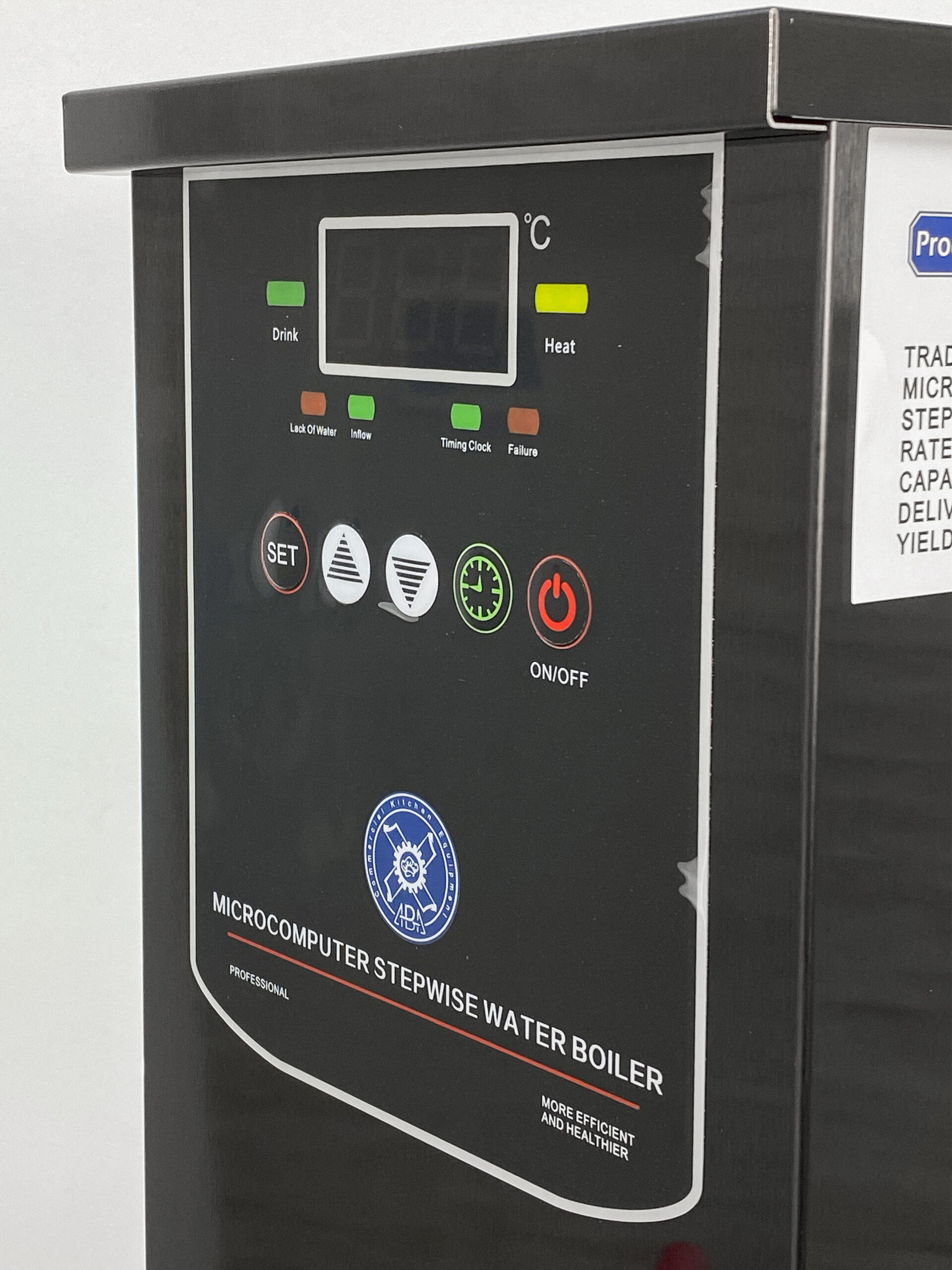 - دستگاه بویلر آب جوش 20 لیتری دارای یک صفحه نمایشگر جهت نمایش میزان دما و دکمه ی روشن و خاموش و نمایش ورود آب تا خارج شدن آبجوش.