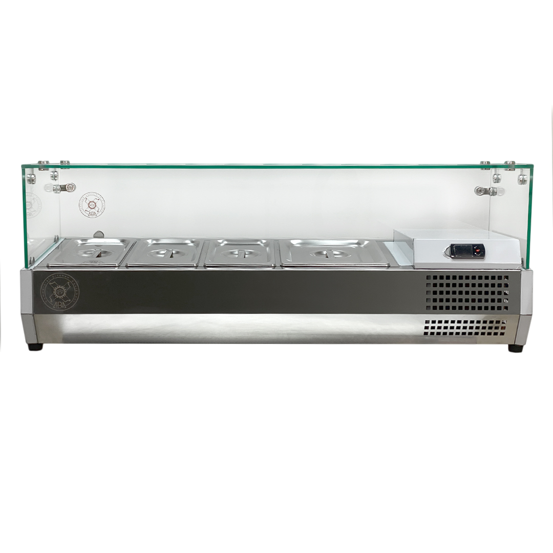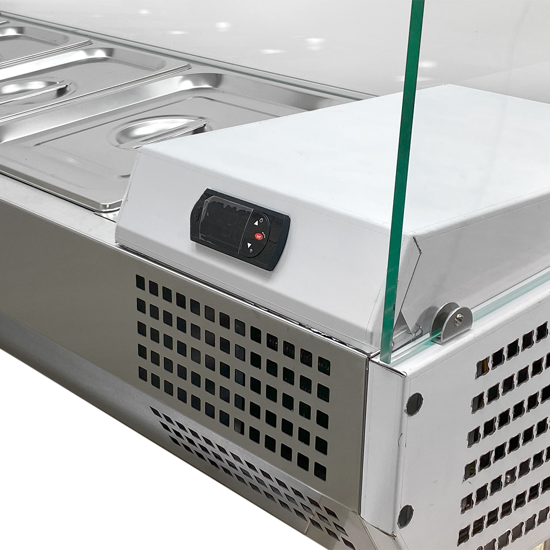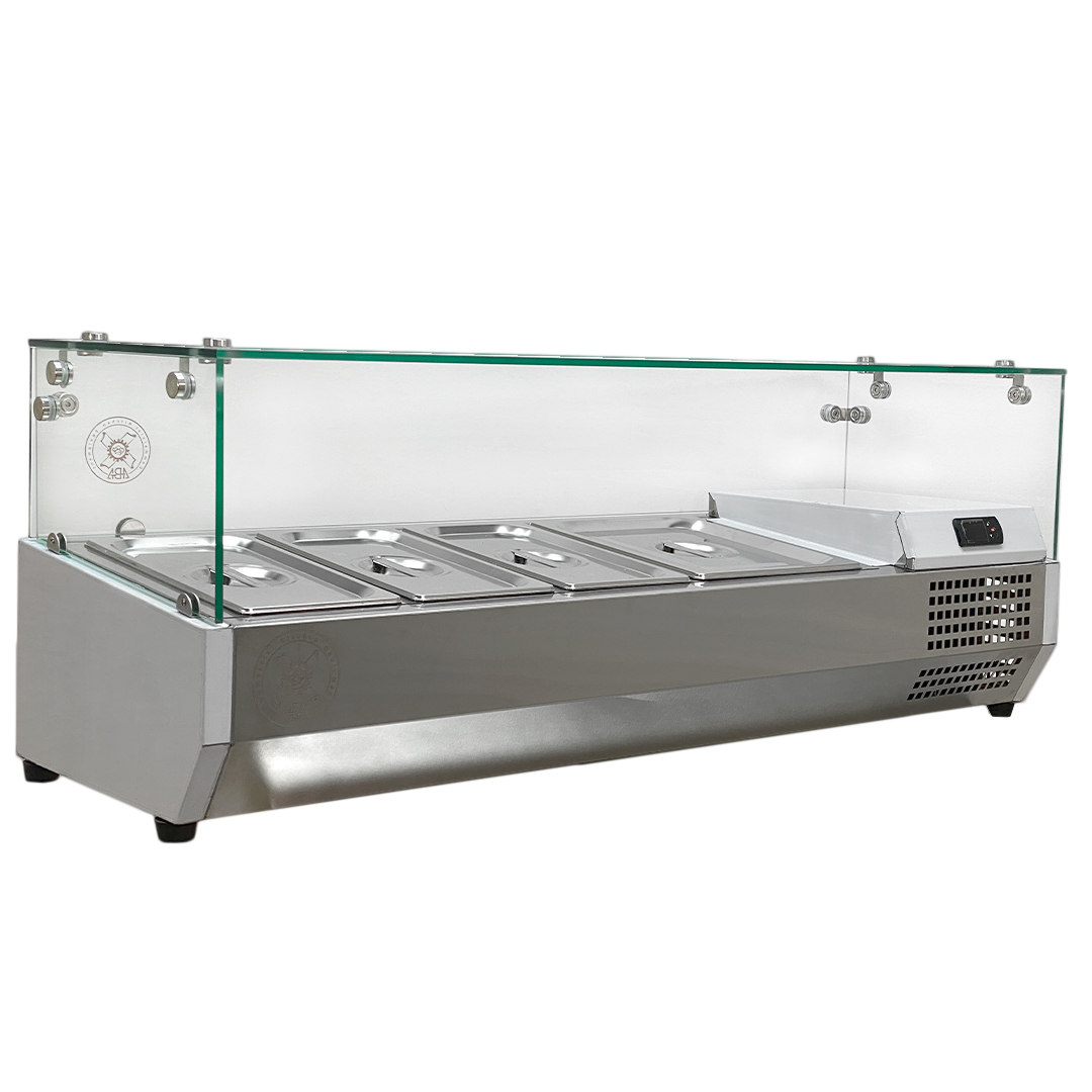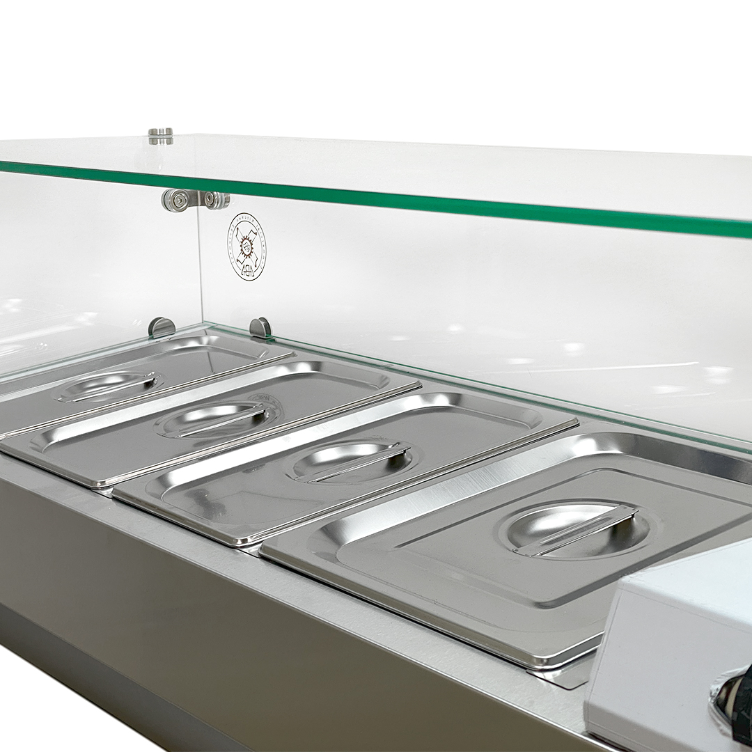 • برای جلوگیری از ورود و نشستن هر نوع آلودگی روی مواد غذایی جدا شده، روی دستگاه تاپینگ سرد رومیزی شیشه تعبیه شده تا سرو مواد غذایی و سالاد و یا حتی انواع ترشی کاملا بهداشتی و اصولی ساخته شده است.