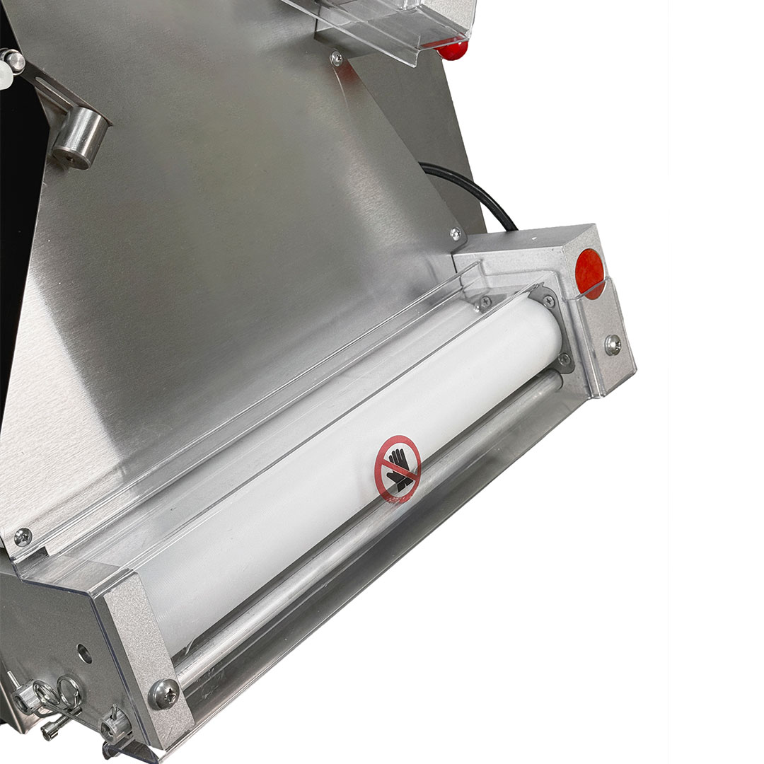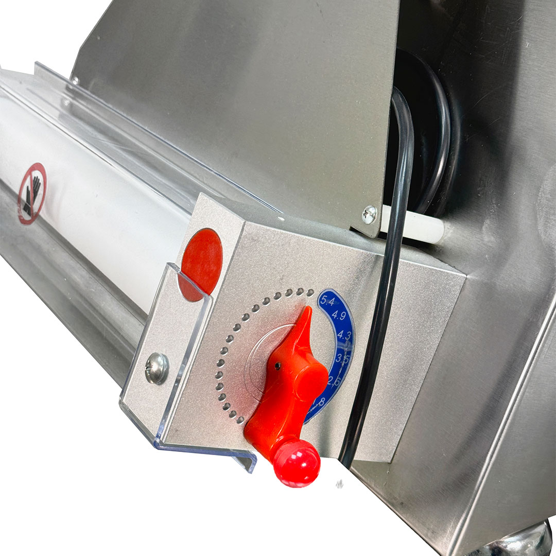 - عرض خمیر قابل تنظیم می باشد که شما می توانید با کمک اهرم کنار دستگاه خمیر پهن کن عرض خمیر را از 10 سانت تا 30 سانت تنظیم نمایید.