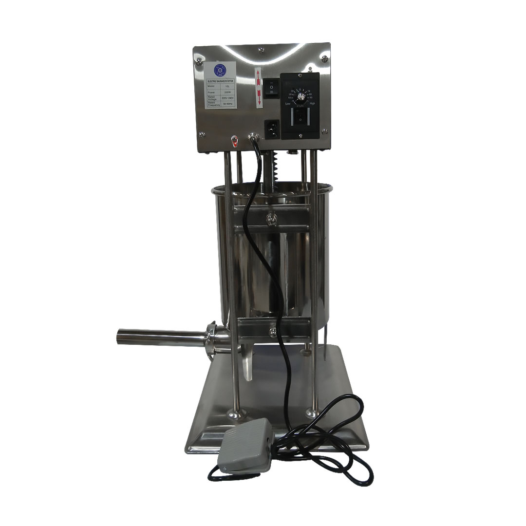 - دستگاه سوسیس پر کن برقی 10 لیتری با استفاده از پدالی که تعبیه شده است می توانید مواد داخل مخزن مانند گوشت یا مایع لازم برای پر کردن سوسیس را له و طبق سایز سری قرار داده شده جلوی دستگاه، میتوانید سوسیس مد نظر را داشته باشید.