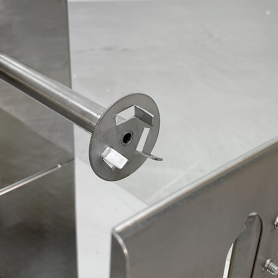 - سپس سر سیخ چوبی را از تیغه ی جلوی دستگاه به بیرون قرار دهید و انتهای آن را که سیب زمینی قرار دارد را داخل چنگک انتهایی قرار دهید و آن را به خوبی چفت کنید.
