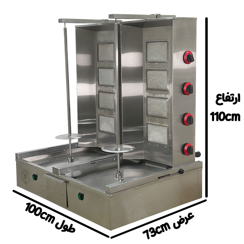- ابعاد دستگاه دستگاه کباب ترکی صنعتی دو سیخ 4 شعله طول 100 در عرض 73 با ارتفاع کلی 110 سانتی متری با قابلیت قرار گیری روی هر میز و کانتری در فست فودی ها جهت جلب توجه مشتری می باشد.