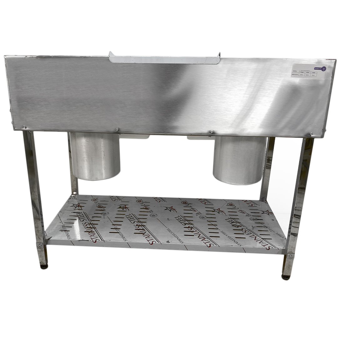 • ابعاد دستگاه میز بردینگ اسپایسی دو لگن طول ۱۵۰ در عرض ۷۸ با ارتفاع ۱۲۱ سانتی متر با یک لگن برای آرد و یک عدد سطل آب و طوری استیل برای آب کشی مرغ و مواد غذایی می باشد.
